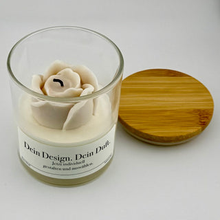 Personalisierte Duftkerze „Rose Weiß“ im transparenten Glas, 14 oz, mit Bambusdeckel